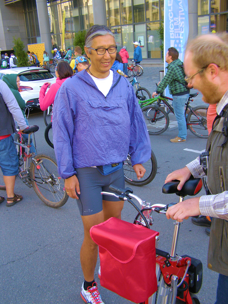Из велосипедной публики на пробеге ожидался еще один мой друг - Павел Гаврилов на складном электробайке. Около 11 часов утра мы втроем встретились под часами на Проспекте Сахарова между Бульварным и Садовым кольцами. Бескрайнее море велосипедистов начало здесь наполняться еще до 10 утра и потому протолкнуться было сложно. Старт ожидался в 11:15, но было ясно что одновременно многим тысячам байкеров из стартового коридора не выехать - их действительно начали выпускать порциями и весьма сдержано, что бы не создавать на кольце уж слишком плотный поток.